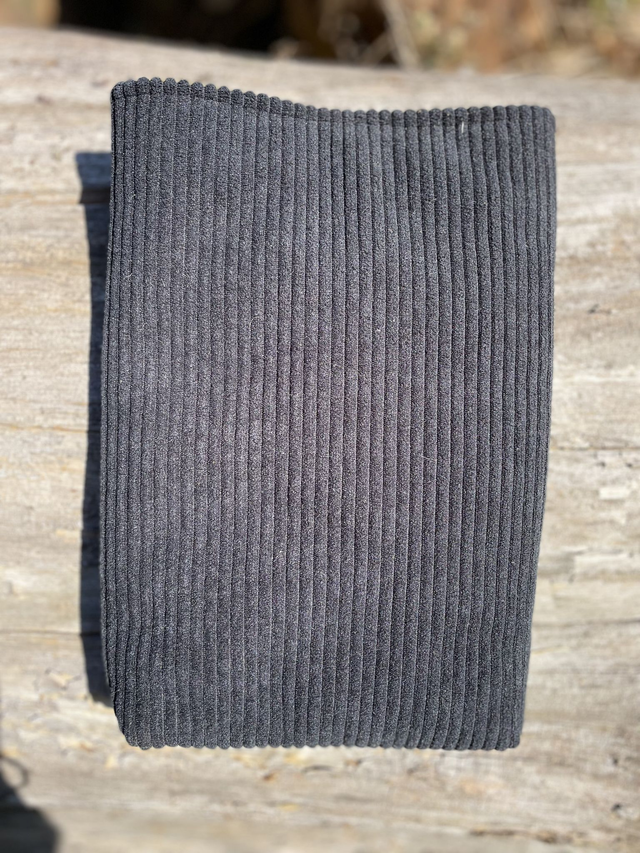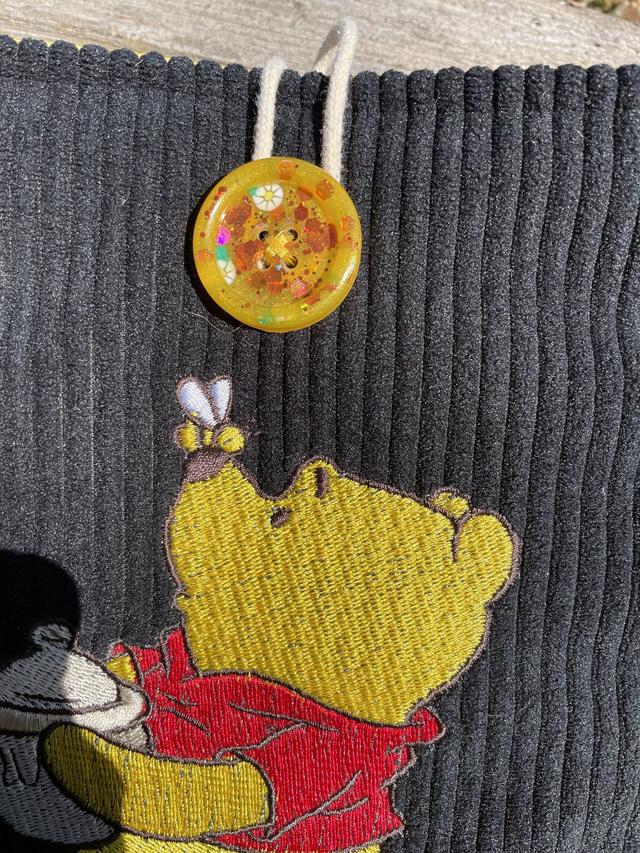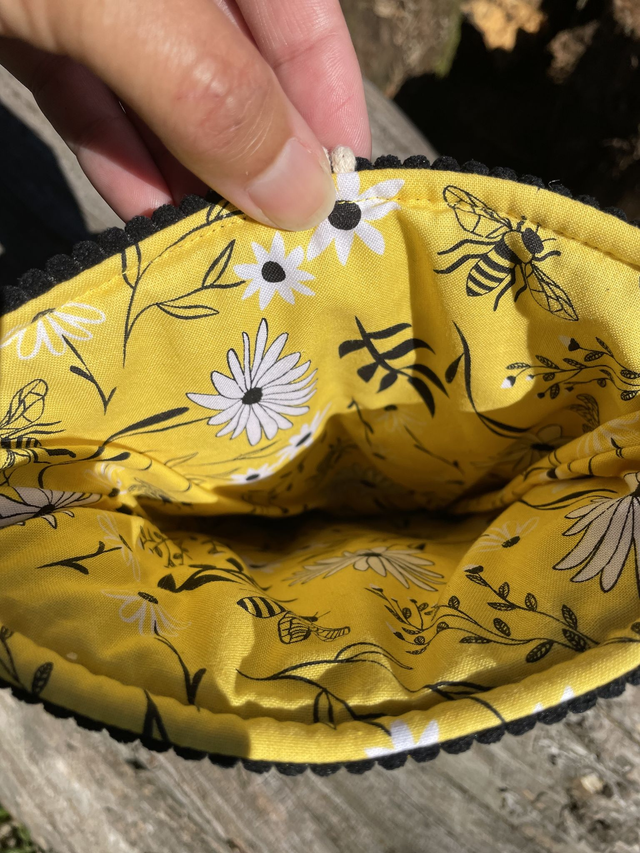 En velours cotelé noir et tissu à motifs fleurs et abeilles à l’intérieur.